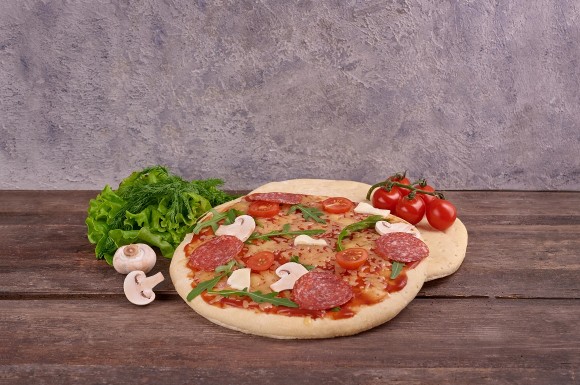 Викладіть на неї улюблений соус, кружальця ковбасок, помідорку та притрусіть зверху сиром і зеленю. Додайте духмяних спецій та відчуйте смак теплої і сонячної Італії.