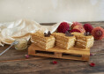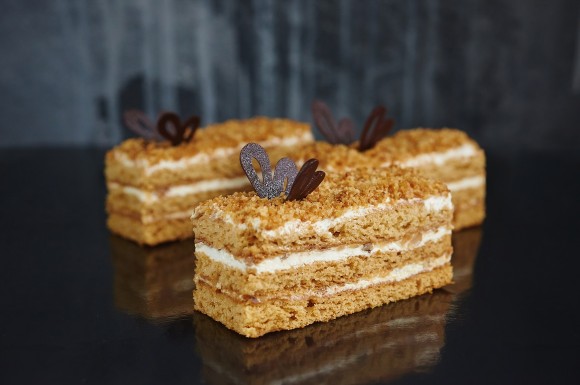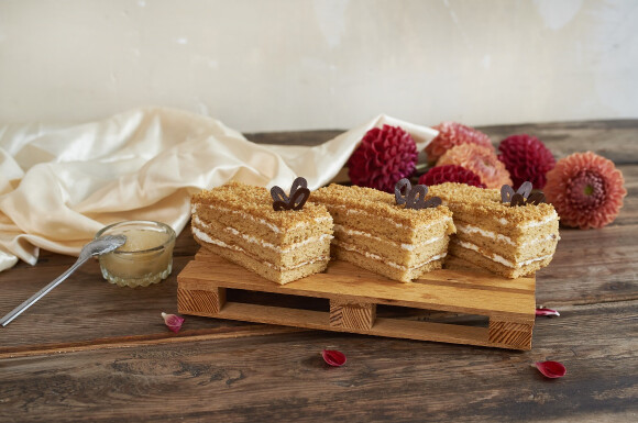 Борошно пшеничне вищого сорту, цукор, сметана, спред, яйця, мед з різнотрав’я, крем кондитерський, горіх волоський, глазур кондитерська, сода, регулятор кислотності лимонна кислота, ароматизатор «Мед».