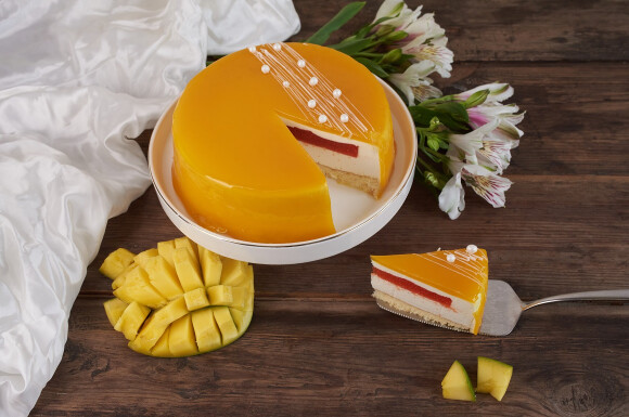 Крем кондитерський, глазур для кондитерських виробів, наповнювач "Манго-маракуйя", молоко, шоколад білий, цукор, яйця, борошно пшеничне вищого сорту, желатин, олія, глазур кондитерська біла, розпушувач хлібопекарський.